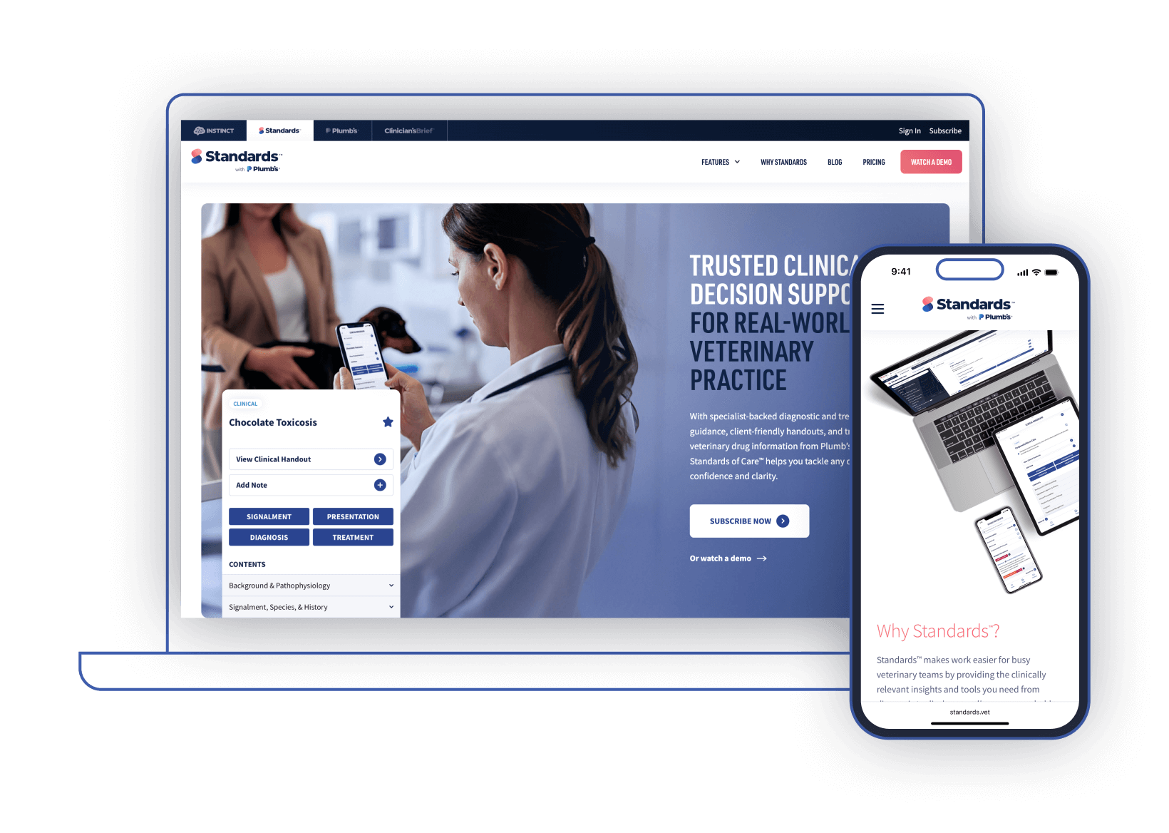 All content on this page is for illustrative purposes only, showcasing design work on the Standards of Care website. It is not intended as veterinary or medical guidance. Screenshots may contain outdated information, as the website and app are continually updated, and pricing is subject to change.