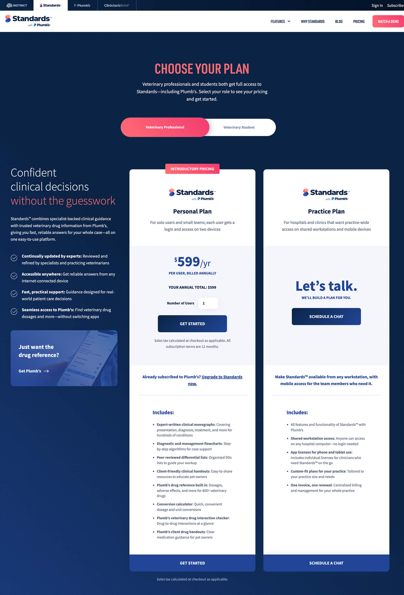 The Standards pricing page presents 3 plans, dynamically highlighting the premium Practice Plan for teams of 3 or more. Users with 31+ seats are offered custom plans. Vet students get a free plan, while users seeking only the drug reference are directed to Plumb’s pricing via a dedicated CTA.